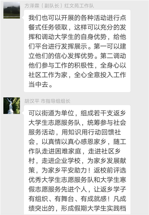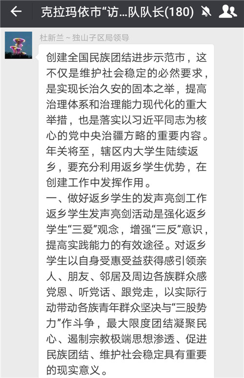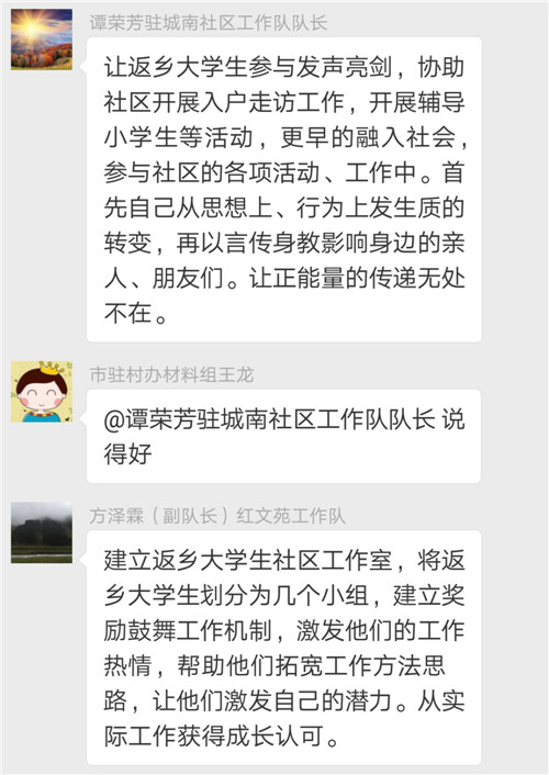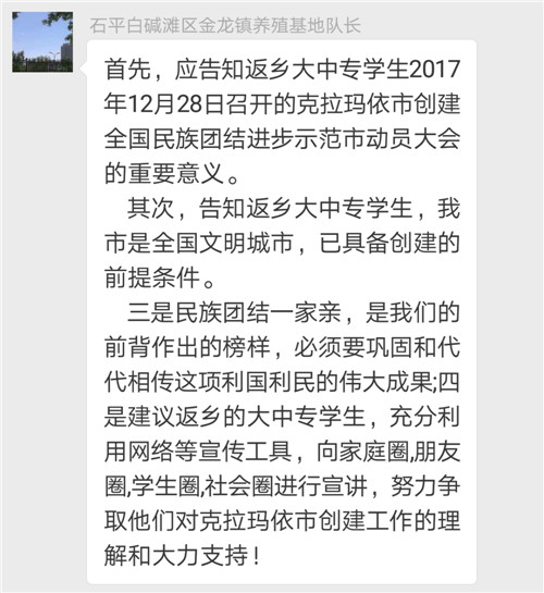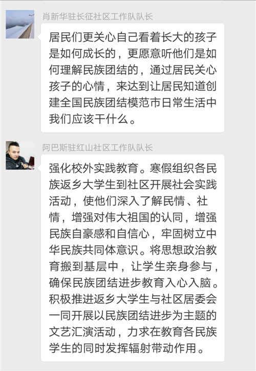 窗外,冰天雪地;群内,气氛热烈。我们总是感动于各位队长强烈的责任心、持续的热情和四溢的才华。创建全国民族团结进步示范市是全市各族干部群众共同的福祉,更是我们共同的责任。今天,各位队长的发言有独到见解,有些思路针对性和可操性强,使大家深受启发,也必将成为其他工作队开展工作的有益参考。独山子十一社区工作队队长杜新兰的强化返乡学生中华民族共同体意识,拓湖社区工作队队长热依沙的通过组建大学生宣讲队宣讲十九大精神、宣讲三个离不开,城南社区工作队队长谭荣芳的通过社会实践、加强大学生社会责任感及担当意识的思路很有现实意义,值得我们学习借鉴。通过综合评定,拓湖工作队队长热依沙、独山子第十一区工作队队长杜新兰、城南工作队队长谭荣芳为本期最牛队长。