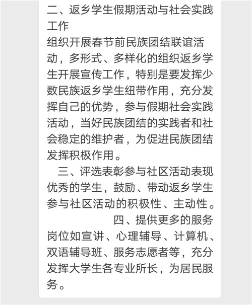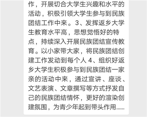我认为民族团结是每个人都应该维护的,只有各族人民共同团结在一起,才可以创造和谐稳定幸福的生活。我们将继续努力,结合日常社区工作内容,扎实做好返乡大学生工作,把民族团结宣传工作做到每位居民心里去。