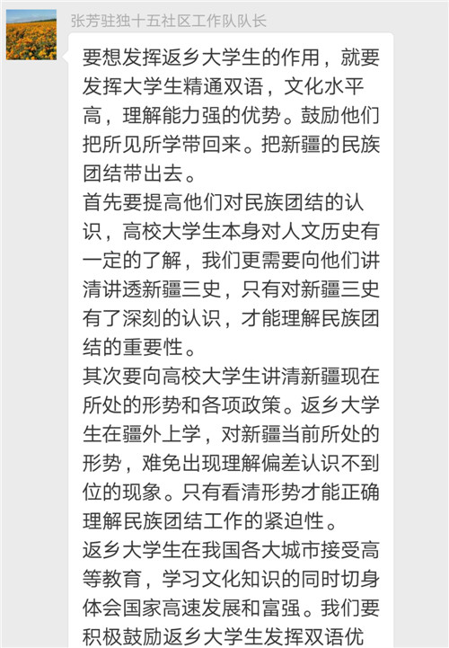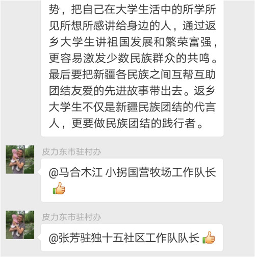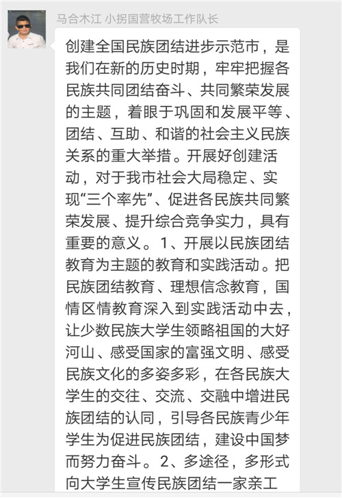 我们每一个新疆人都要做到手拉手,心连心,同呼吸,共命运。无论是学生还是其他人员每一个人需要从自己做起,从一点一滴的小事做起,自觉做到不利于民族团结的话不说,不利于民族团结的事不做。各民族同胞要像石榴籽那样紧紧抱在一起,共同筑起一道维护祖国统一、反对民族分裂的铜墙铁壁,新疆的明天会更灿烂。每一次论坛都能收获很多,感谢市“访惠聚”办。