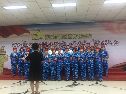 6月29日下午,克拉玛依区退休管理站在建党96周年来临,组织区属退休人员近二百人激情开唱,喜迎“十九大”。虽然表演者都是退休人员,唱功远不及专业歌星,但他们的演唱热情却感染着全场退休人员。在《没有共产党就没有新中国》、《唱支山歌给党听》等一首首红歌令一阵阵热情的掌声从活动现场里传出。