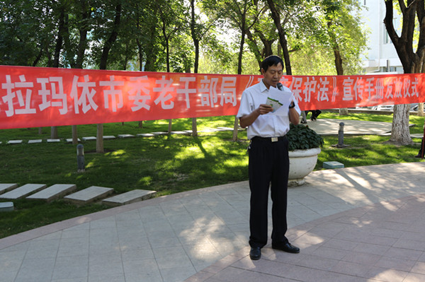8月29日,市委老干部局在市机关退休站门前小广场举行新《环境保护法》环保宣传手册发放仪式,市委组织部副部长、老干部局局长木塔力甫·克力木,市委老干部局副局长陶胜利以及300余名退休职工参加了发放仪式。
