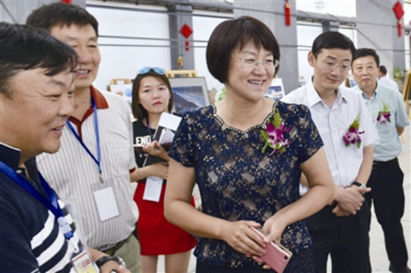8月28日,祝贺香(左四)等市领导与嘉宾观看展出的作品。