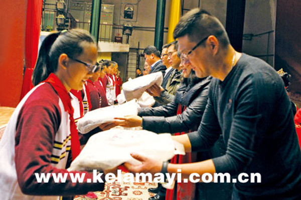 11月4日,在位于白碱滩区的我市第十中学俱乐部举行的“衣加衣”爱心慈善捐助仪式上,被助学生代表、第十中学初一(15)班的排日扎提在发言时说。