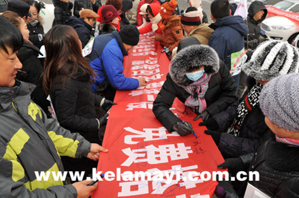 市区准噶尔路活动现场,志愿者及市民在横幅上签名。