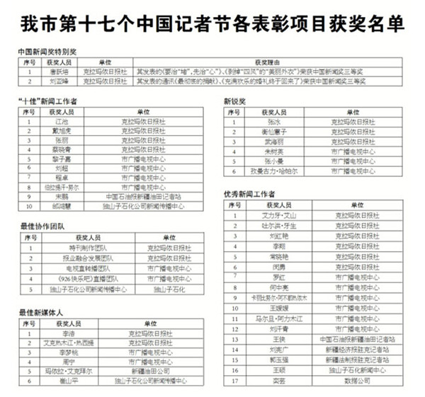 此外,最佳协作团队奖是在新闻工作中有突出贡献的优秀团队而设,共有克拉玛依日报特刊制作团队等5个团体获得此奖项。