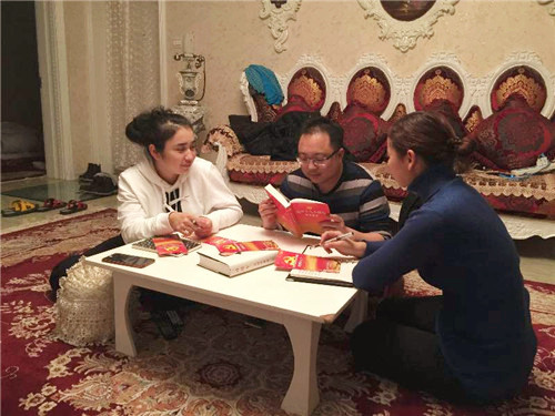 在亲戚家吃了晚饭,工作队队员努尔古丽·喀坎就喊全家人过来。“现在到了学习时间,今天我们全家人要学习的内容是党的十九大精神。”一家人坐在地毯上,拿出十九大报告学习内容,共同学习党的十九大报告原文和相关惠民政策……