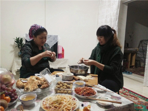 哈克村村民鲁卡·巴特那生家格外热闹,得知区卫计委干部阿瓦古丽·买买提依明要带着孩子住在他家,鲁卡老两口一大早就把房间收拾得干干净净,剁好馄饨馅、擀好皮,等待阿瓦古丽来了后大家围坐在一起包起了馄饨。鲁卡的妻子朱热·杜古尔笑着说,“平时家里就我们老两口,家里人多了才更有家的感觉,我还要感谢你们来陪我们两个老家伙呢!”