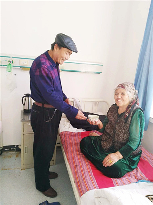 干部沙拉克·杜古尔带着礼物来到亲戚造日汉·托日翁老人家中,在得知造日汉老人因身体不舒服住院后,沙拉克每天在家里做好饭给老人送去,端水递药无微不至的照顾,盼望他能尽快康复早日出院。