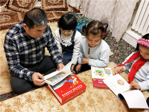 “孩子们,都来听伯伯讲故事喽……”入住对子阿卜杜合力力·阿卜杜克热木家以来,驻园丁乐园社区工作队副队长邵静中每天都要给孩子们讲解《建设美丽新疆,共圆祖国梦想》中的系列故事……