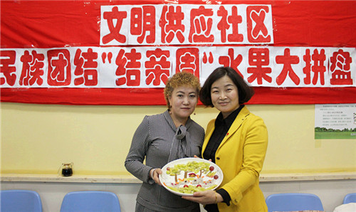 “这是我的维吾尔族大姐米力古,我们制作的水果拼盘叫做‘民族团结之花’,我们愿与各族群众一起同心同德、风雨同舟,愿民族团结之花常开常盛!”社区工作人员陈晓燕和结亲对子米力古一起给大家介绍着她们制作的水果拼盘。