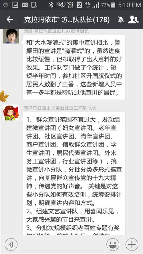 克拉玛依市深入学习宣传贯彻党的十九大精神,组织全市118个驻村(社区)工作队深入基层、深入群众、紧贴实际,打造各种有效、亲民、接地气的活动载体,学好、讲好、用好党的十九大精神,推进党的十九大精神在克拉玛依落地生根、开花结果。
