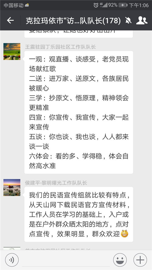 市“访惠聚”驻村工作领导小组办公室通过微信群开办队长交流论坛,每周确立一个学习主题,征集形式活、效果好的实招妙招,先后总结了“五式宣讲”、“四步分解”“六种学习包”等模式,激发和带动全员学好党的十九大精神。