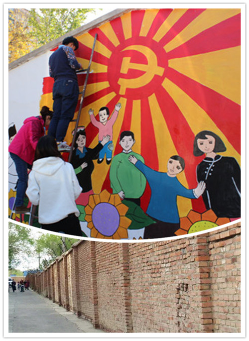 社区的这面墙约300平方米,是处于社区居民出入的必经之路,年久失修导致墙体倾斜,墙面破损严重,存在安全隐患。8月中旬,工作队协调物业对危墙进行加固重建。在十九大来临之际,由工作队、社区“红细胞”党员、楼栋长、各族居民等60余人组成的志愿者队伍,用时半个多月时间,在墙面上以“民族团结一家亲”为主题作画。