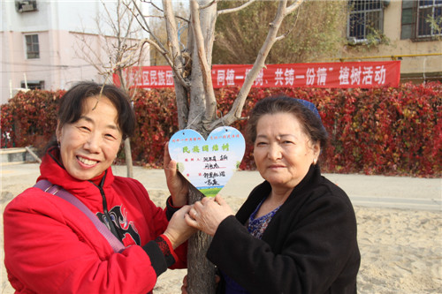 “希望我俩亲手种下的团结树茁壮成长,见证我们之间的友谊感情。”居民刘新玲说着在树枝上挂上“民族团结连心寄语卡”。