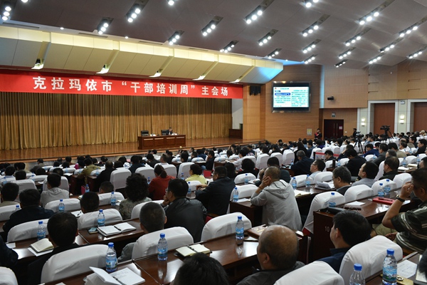 为深入学习贯彻习近平总书记在参加十二届全国人大五次会议新疆代表团审议时的重要讲话精神以及自治区党委九届二次全委(扩大)会议精神,克拉玛依市结合反恐维稳“大反思、大整顿”工作,聚焦社会稳定和长治久安总目标,利用4月24日至28日每天上午半天时间,以集中授课的形式,深入开展了为期一周的“干部培训周”活动,在全市上下掀起了聚焦总目标、落实总目标的学习热潮。